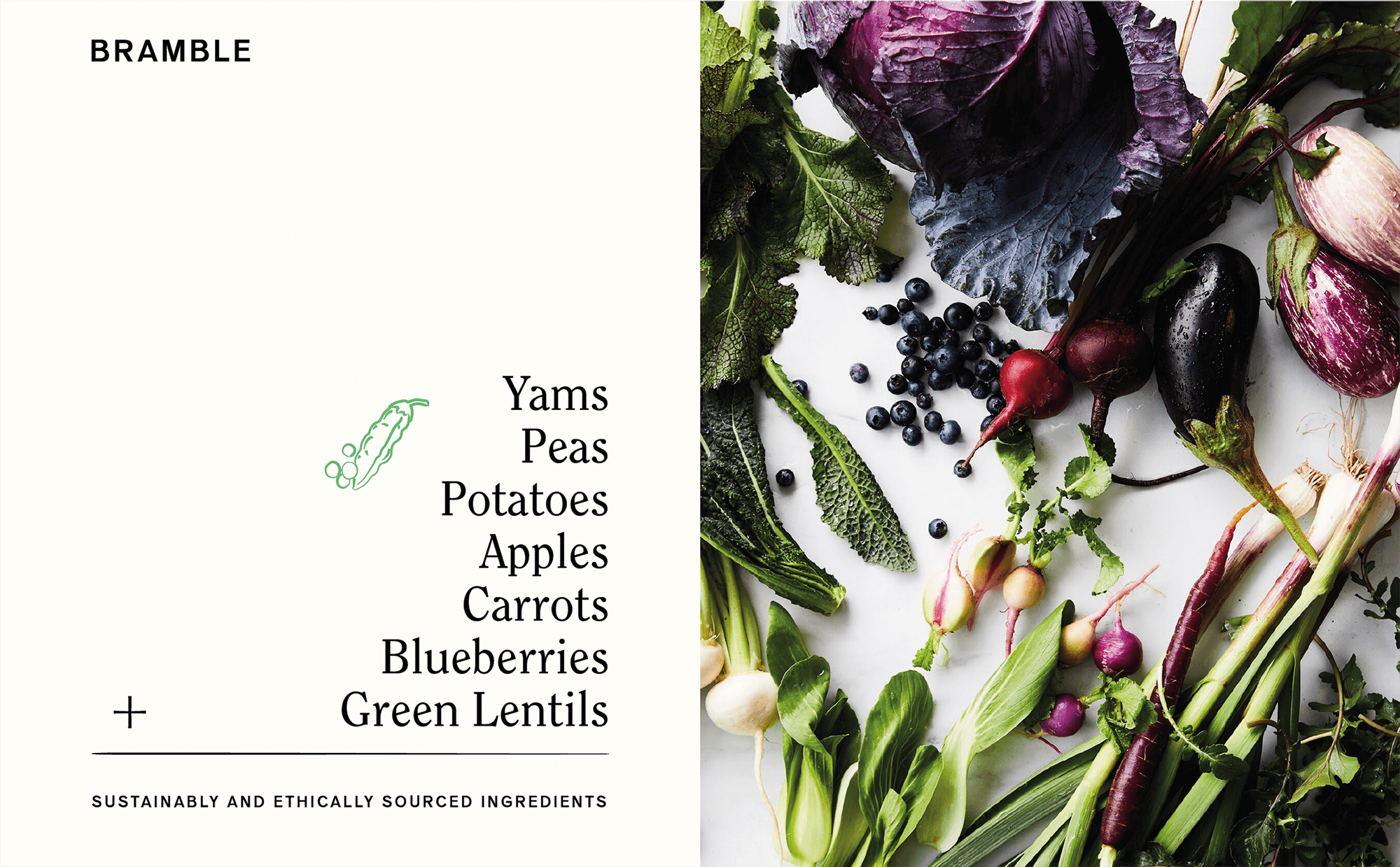 Bramble allie avec finesse exigence nutritionnelle et excellence visuelle. Le design vient renforcer le message de qualité et d’amour des animaux.